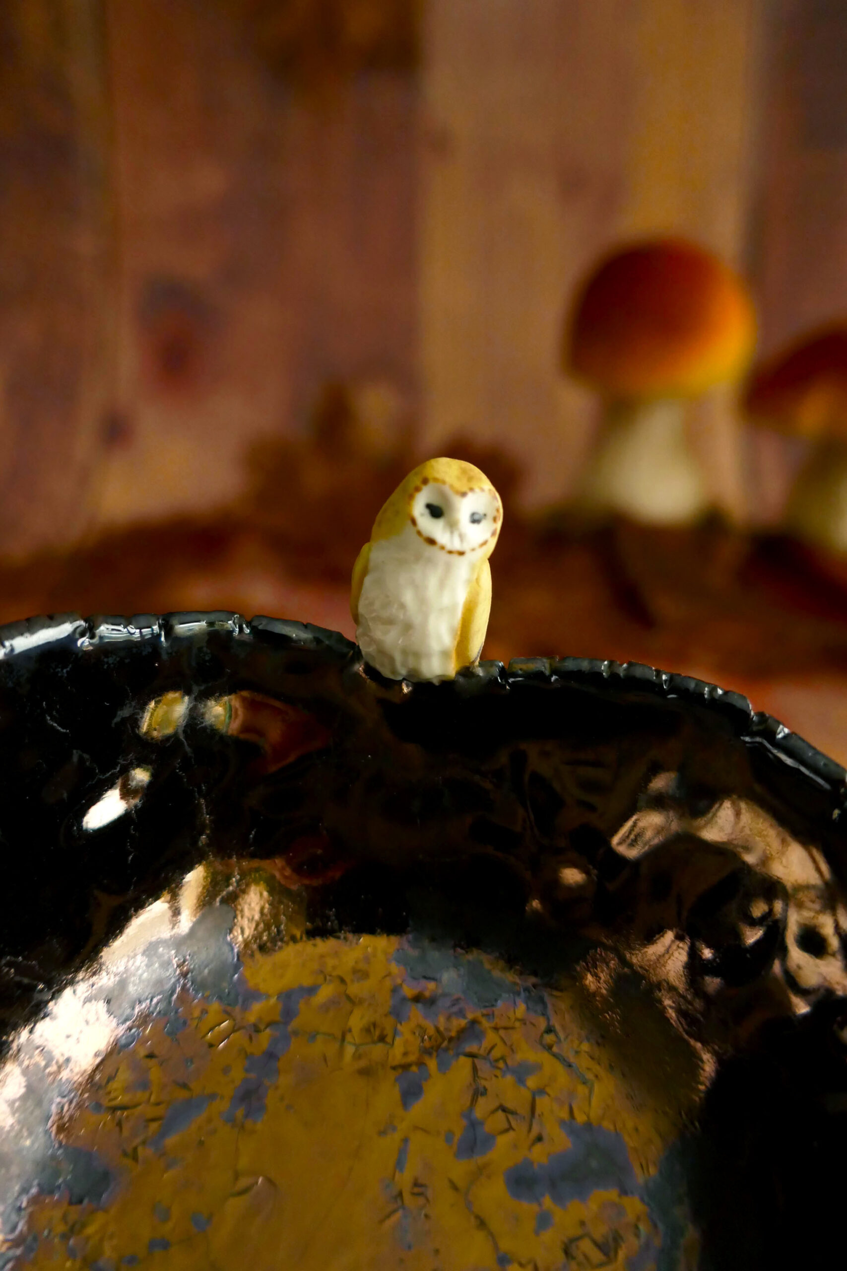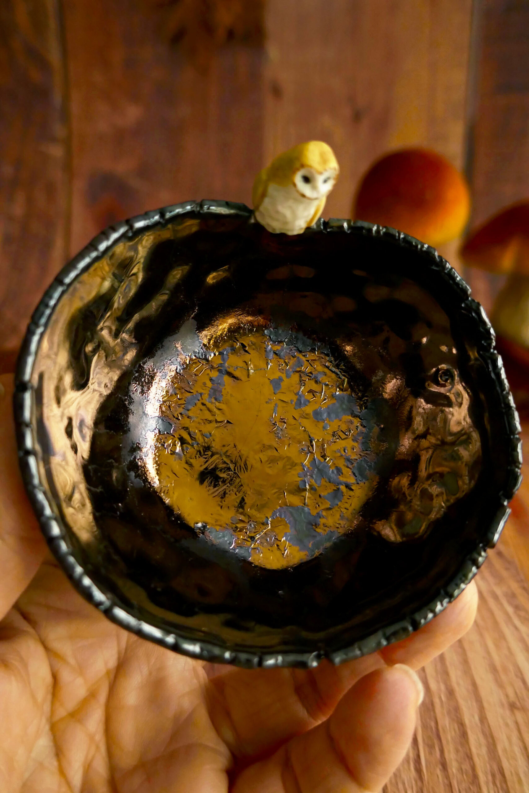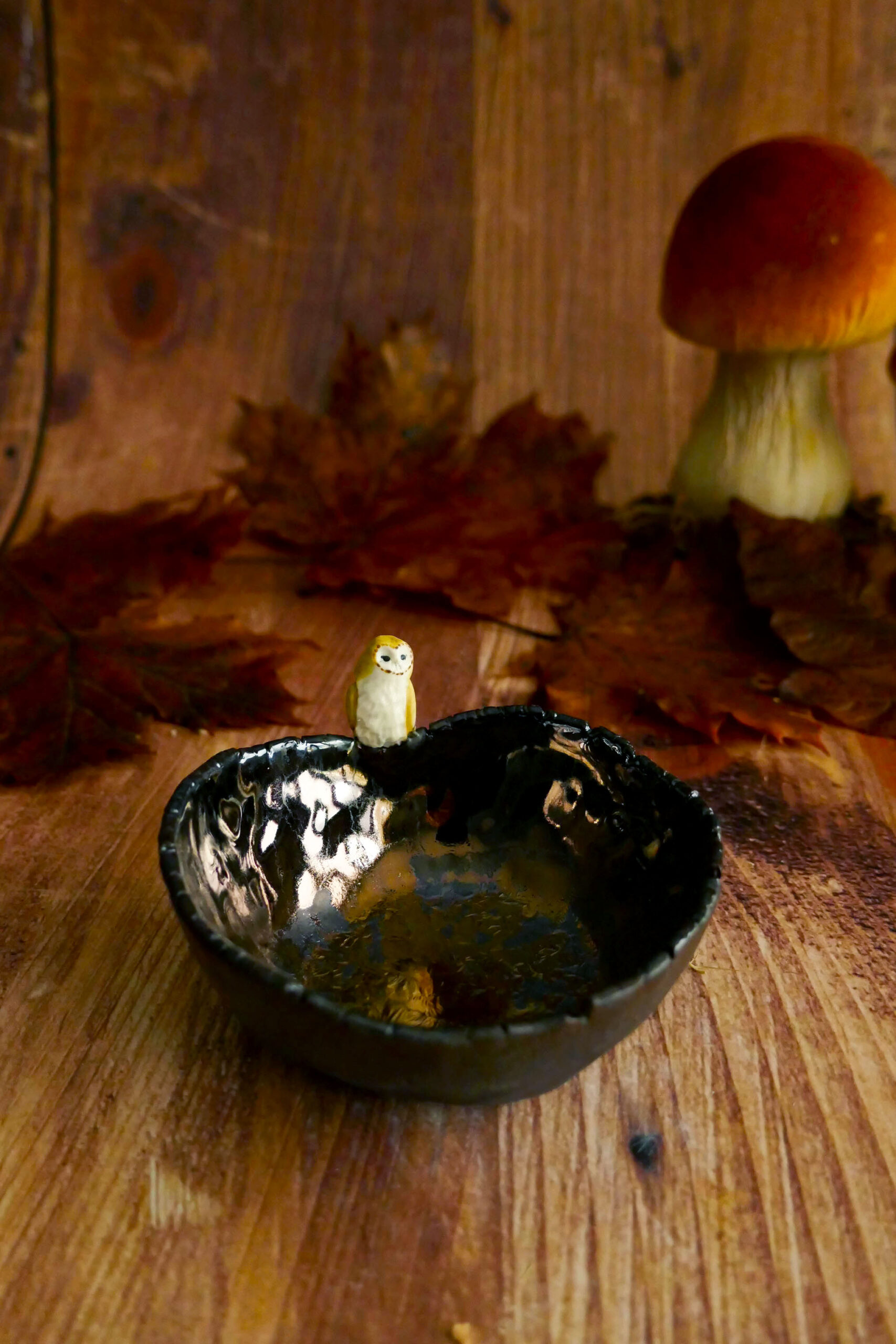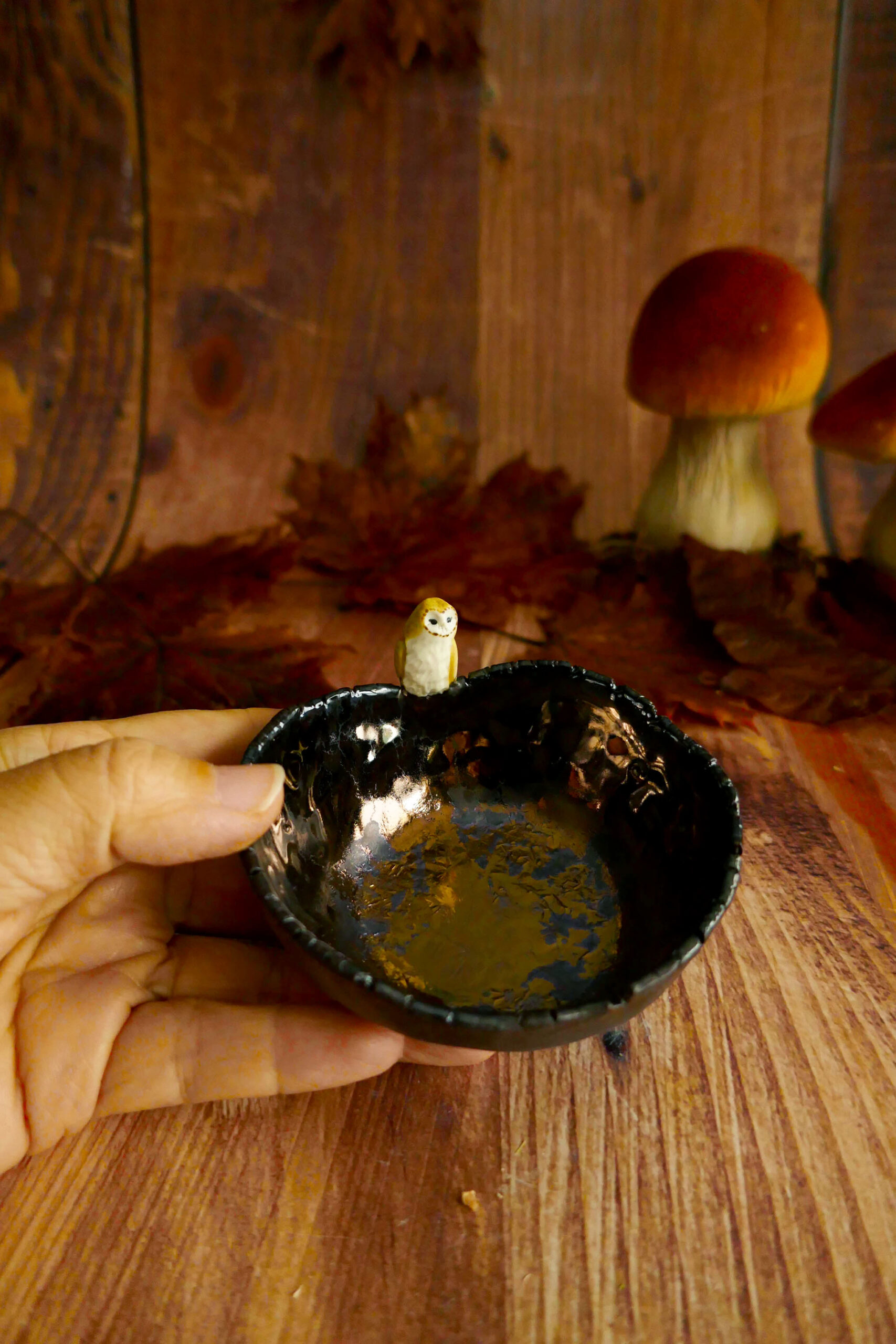 Petit bol en porcelaine façonné entièrement à la main via la technique du « pincé », la petite créature ainsi que les embellissements sont également réalisés à la main en porcelaine. La miniature est peinte à l’aide d’engobes colorés (argile liquide et pigments réfractaires), toutes les couleurs et les motifs, cuits à haute température, sont inaltérables dans le temps.  La pièce est émaillée d’un émail métallique bronze et cuite à 1230°, sa température de cuisson finale qui lui offrira son aspect définitif et toute sa solidité ! Pièce non alimentaire.