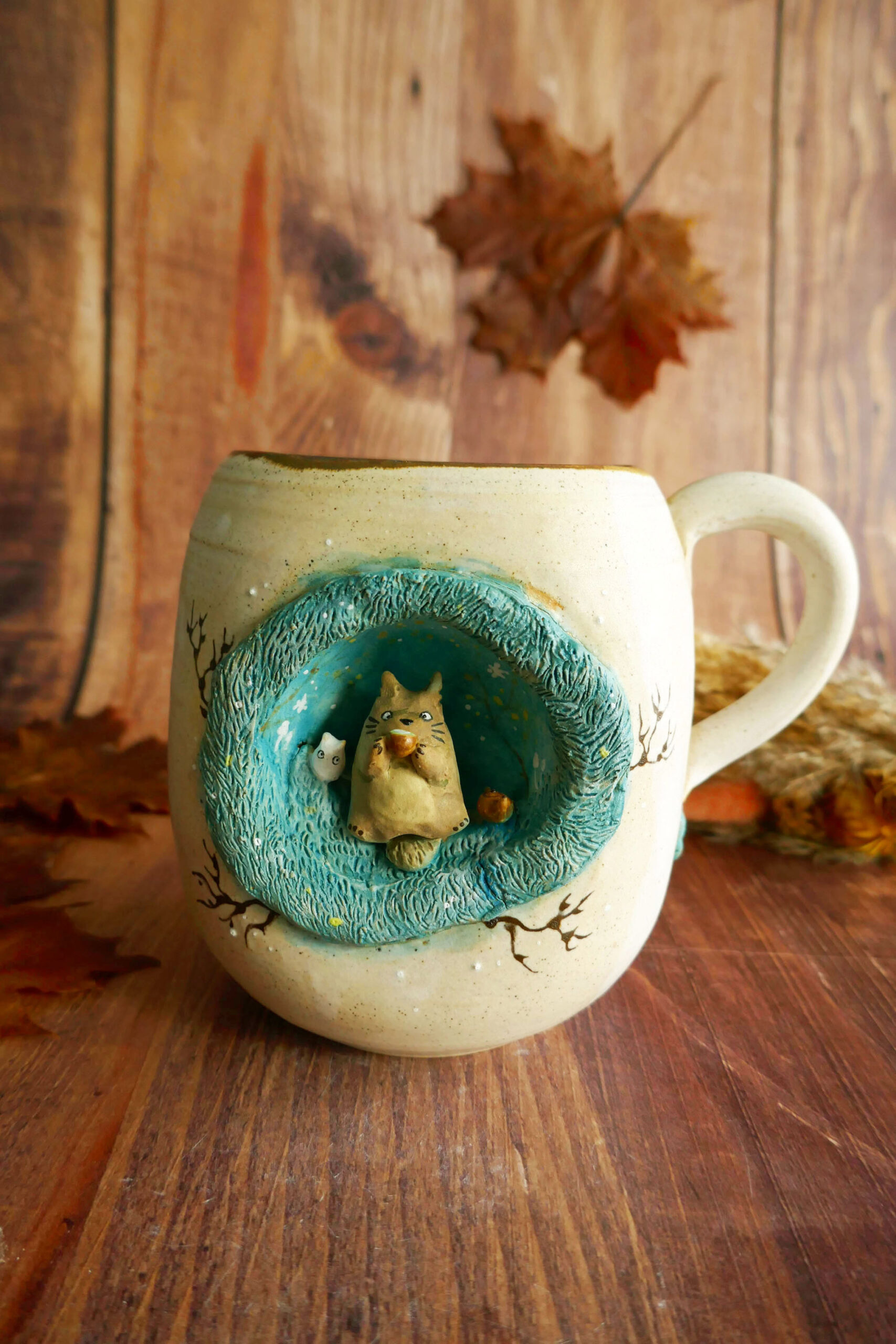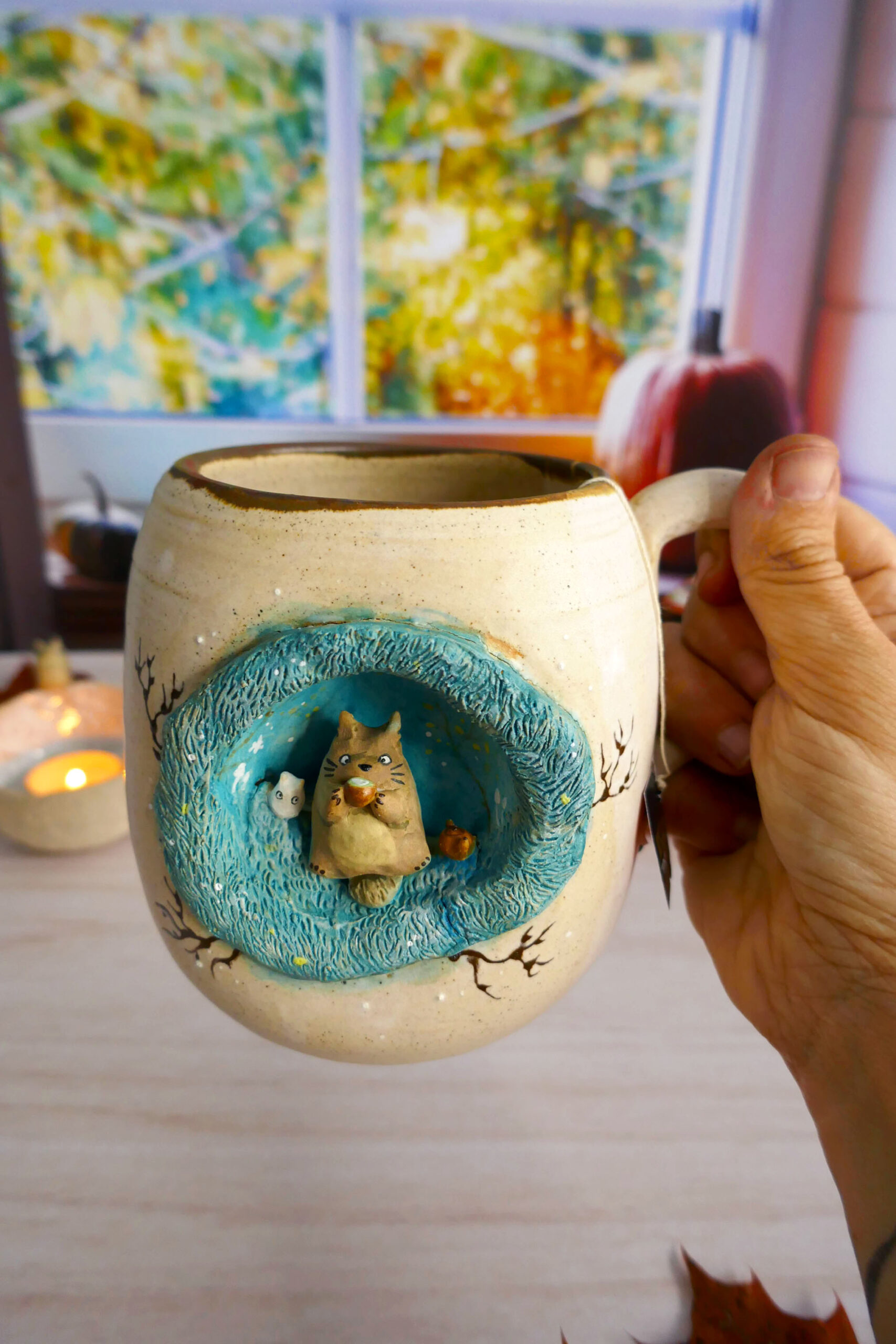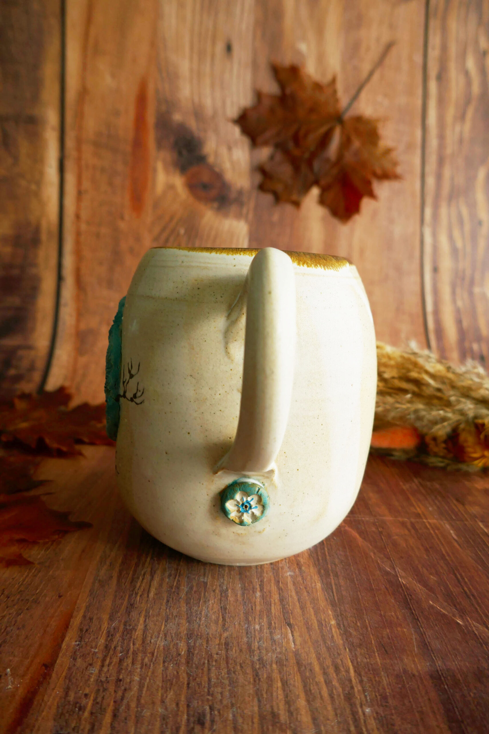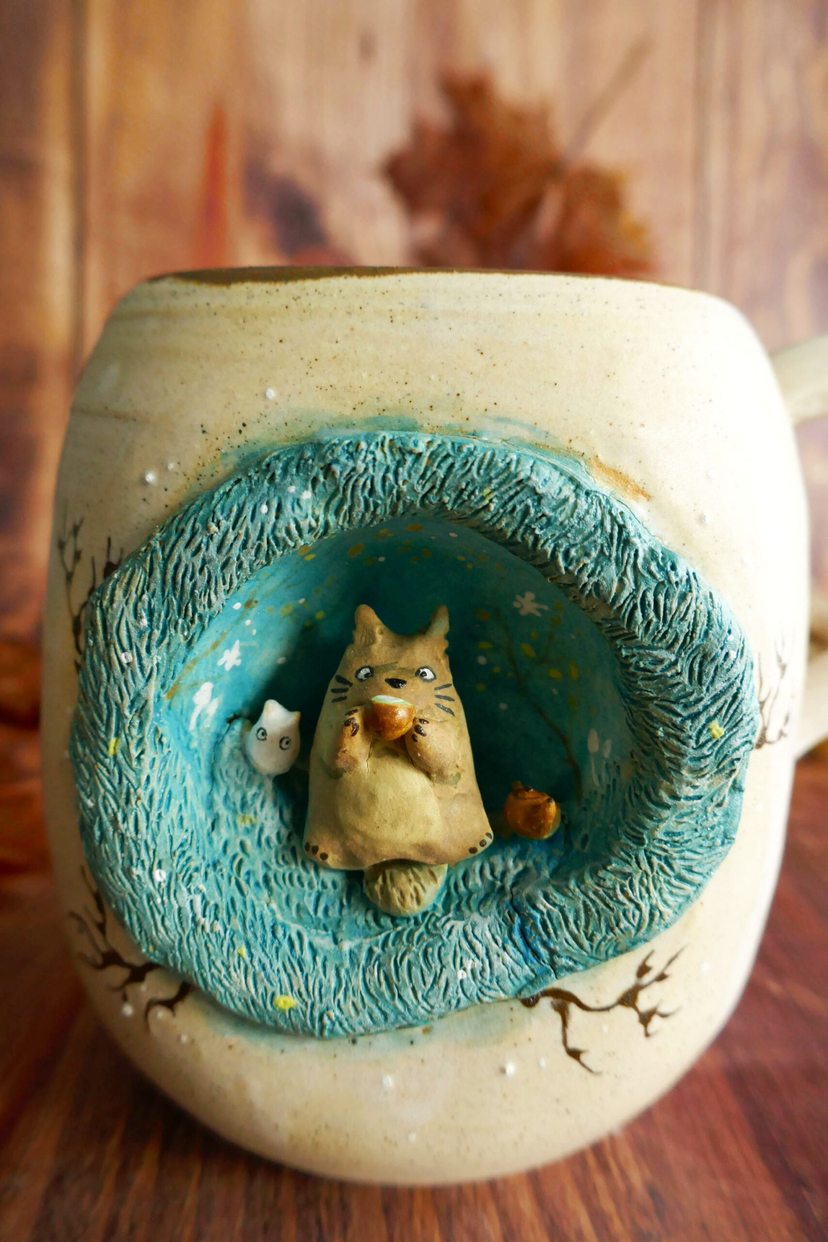 Chope en grès façonnée sur le tour de potier et modifiée à la main, la petite créature ainsi que les embellissements sont également réalisés à la main en grès. La miniature est peinte à l’aide d’engobes colorés (argile liquide et pigments réfractaires), toutes les couleurs et les motifs, cuits à haute température, sont inaltérables dans le temps. Après une première cuisson de dégourdi à 950°, la pièce est recouverte d’un émail alimentaire satiné et cuite une seconde fois à 1230°, sa température de cuisson finale qui lui offrira son aspect définitif et toute sa solidité !