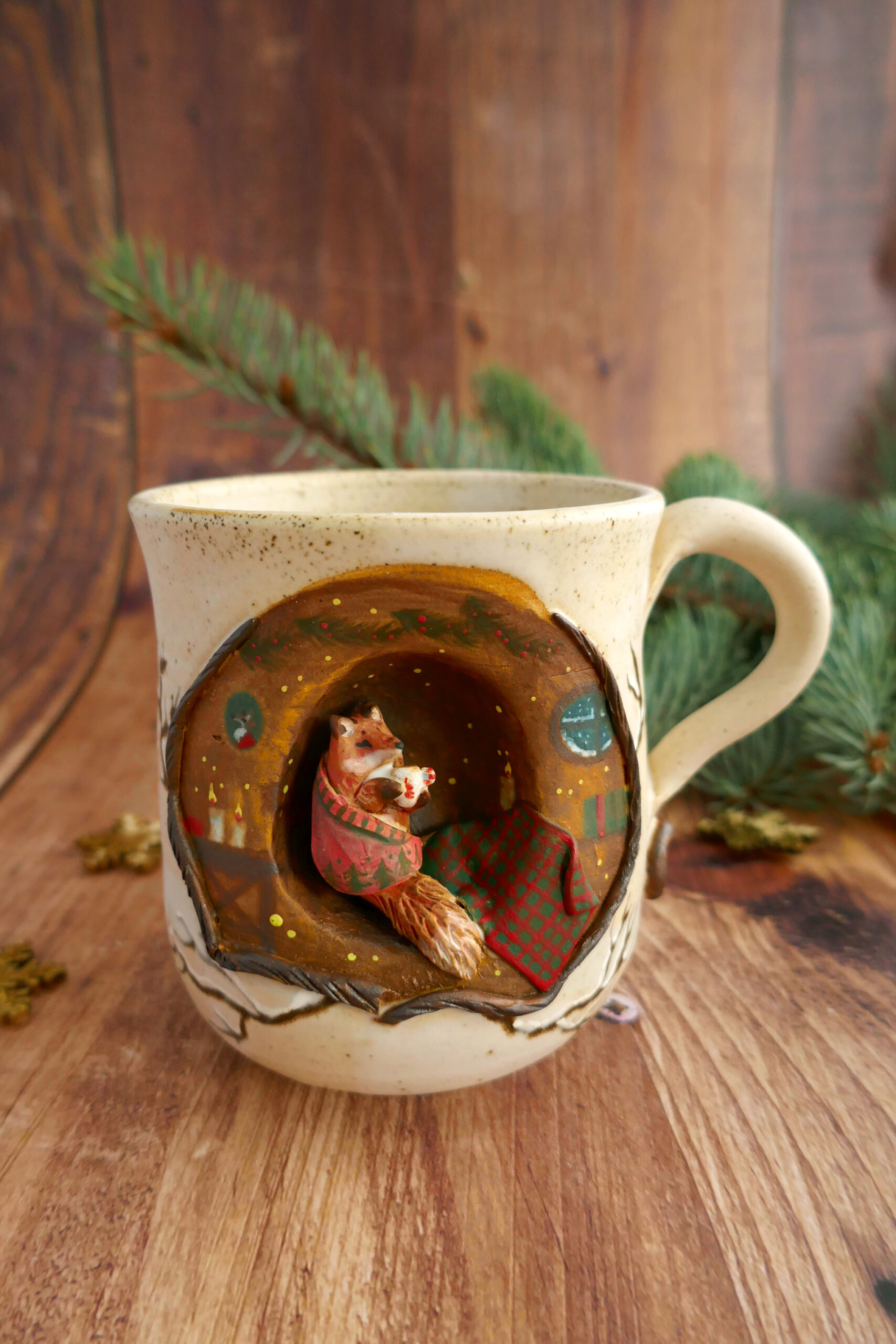 Tasse en grès façonnée sur le tour de potier et modifiée à la main, la petite créature ainsi que les embellissements sont également réalisés à la main en grès. La miniature est peinte à l’aide d’engobes colorés (argile liquide et pigments réfractaires), toutes les couleurs et les motifs, cuits à haute température, sont inaltérables dans le temps. Après une première cuisson de dégourdi à 950°, la pièce est recouverte d’un émail alimentaire satiné et cuite une seconde fois à 1230°, sa température de cuisson finale qui lui offrira son aspect définitif et toute sa solidité !