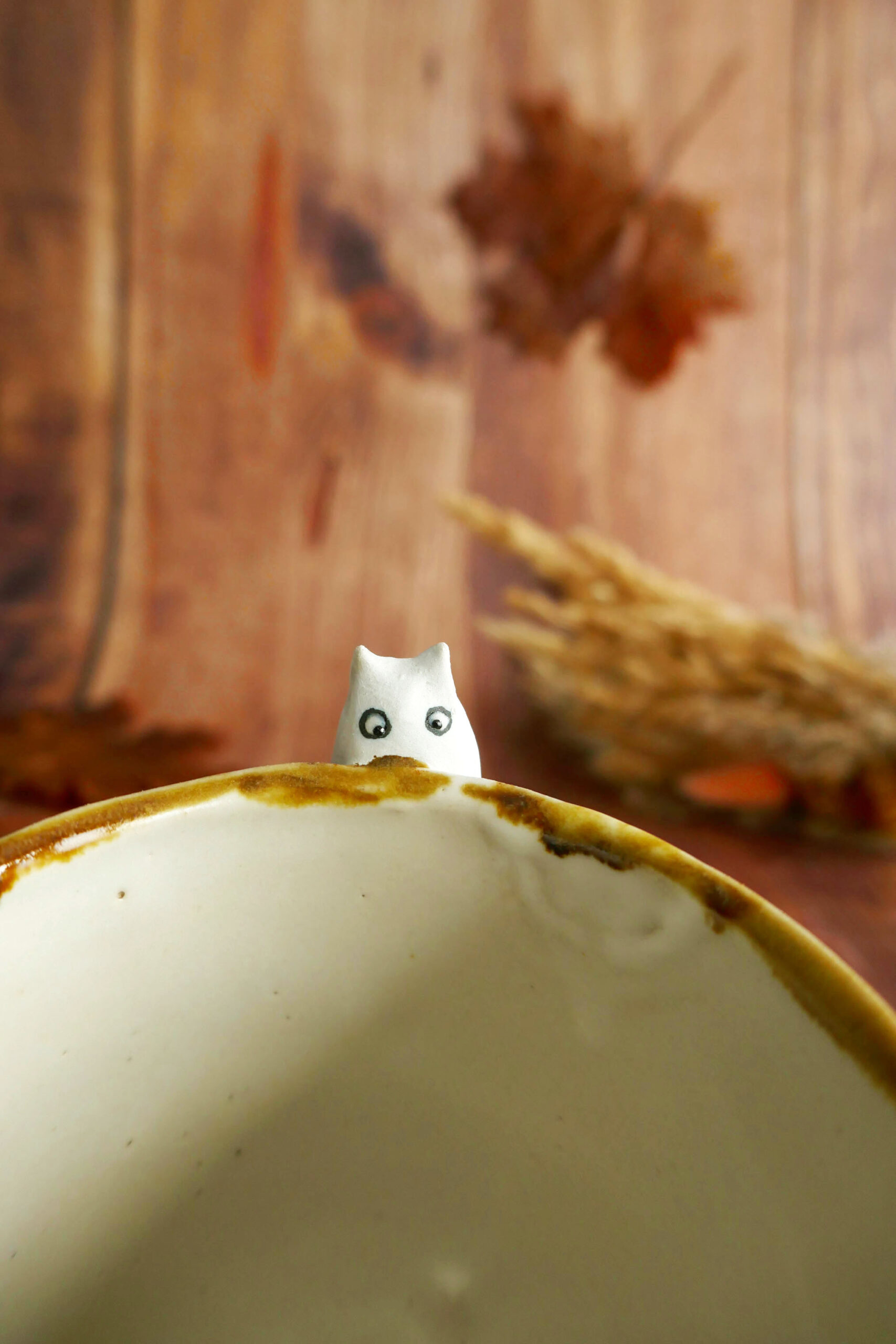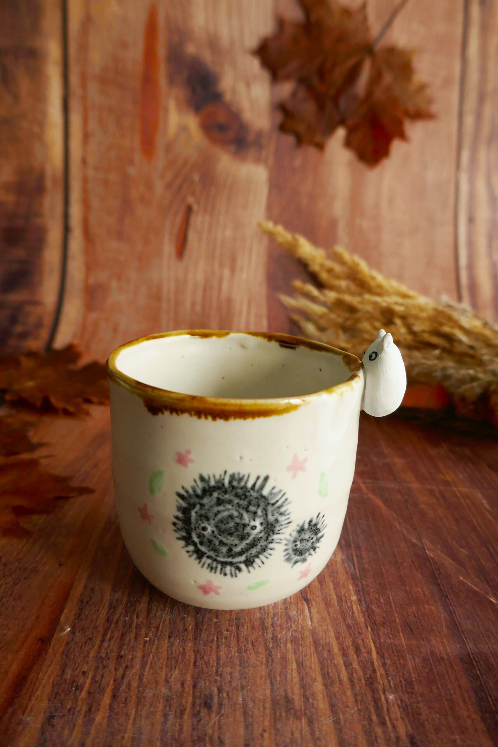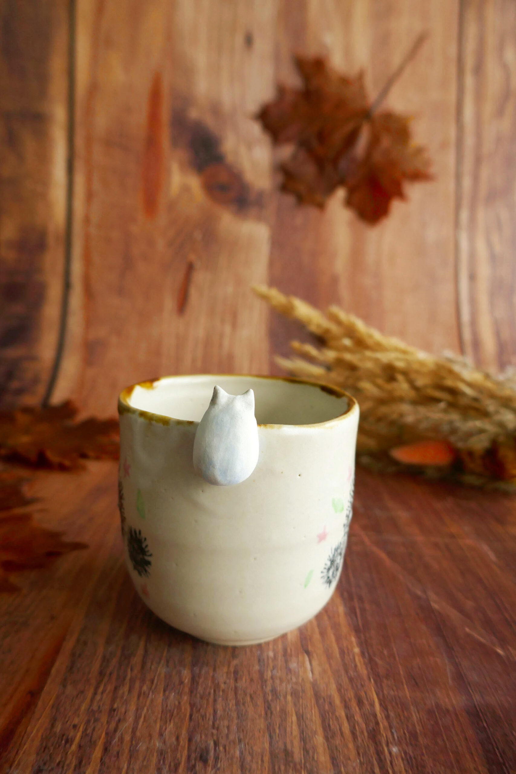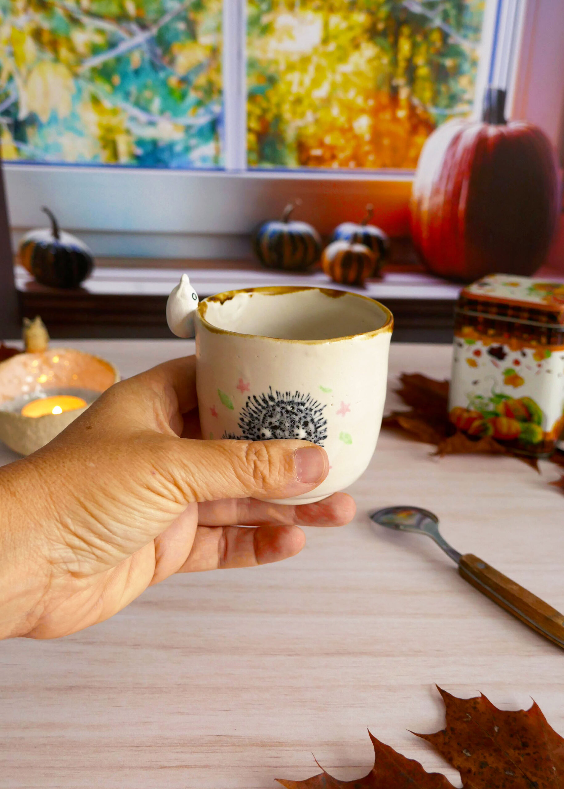 Tasse à café en grès façonnée via la technique du coulage artisanal. La petite créature qui l’habite est façonnée à la main également en grès ou en porcelaine, solidement fixée, elle fait partie de la tasse, elle est ensuite peinte à la main à l’aide d’engobes colorés ainsi que les motifs du décor, et cuite à 950°. Elle est ensuite émaillée avec un émail alimentaire transparent et recuite à 1250°, sa température finale de cuisson qui lui donne son aspect définitif et toute sa solidité ! Chaque pièce est unique avec son propre animal et motif différent.