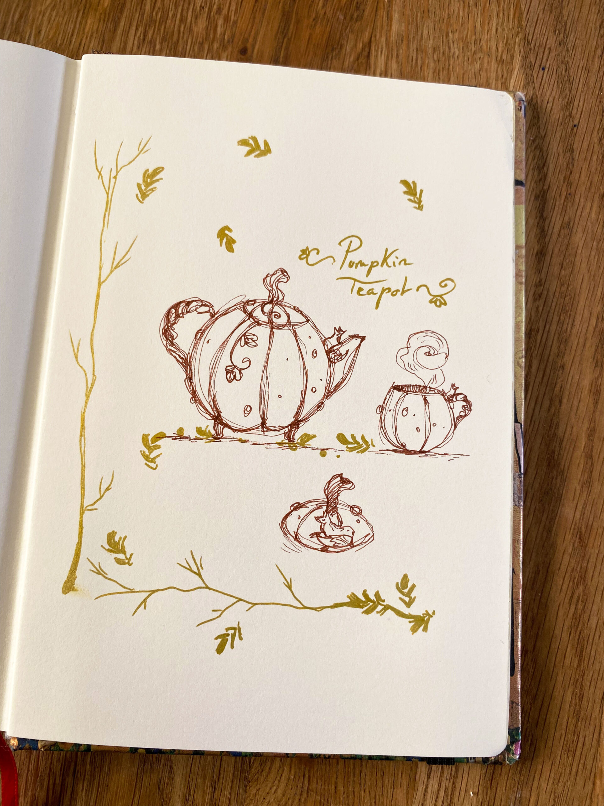 Théière en grès en forme de citrouille avec anse et bouton « entortillée » et petits pieds, verrues, lianes, feuilles et mini habitants ! Un objet qui sera à la fois utilitaire mais également décoratif sur votre table d’automne…