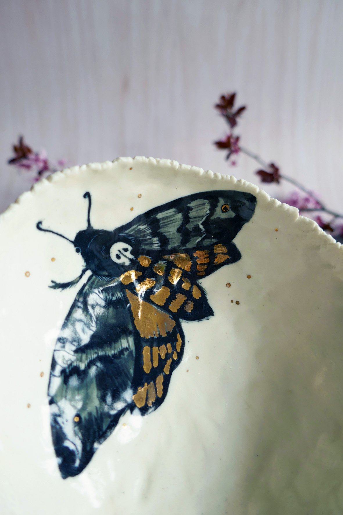 Cette pièce possède des lustres d’or véritables posés à la main au pinceau et cuit une troisième fois à 800° pour être fixés.