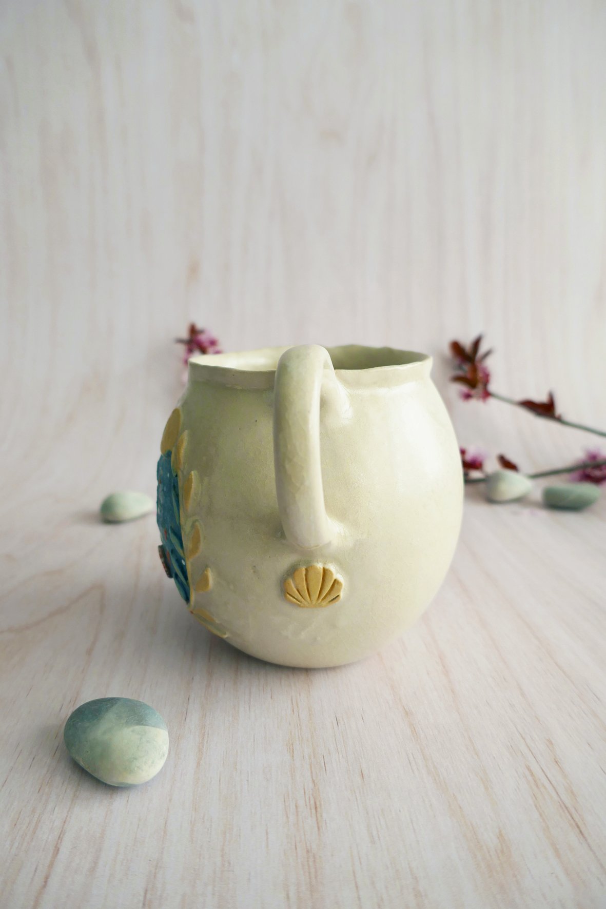 Tasse en grès façonnée via la technique du coulage artisanal et modifiée à la main. La petite créature qui l’habite est modelée à la main en porcelaine et fixée à l’intérieur du bol avant d’être peinte à l’aide d’engobes colorés. La pièce est une première fois à 950° puis émaillée et cuite à 1250°, sa température finale de cuisson qui lui donne son aspect définitif et toute sa solidité ! Chaque pièce est unique avec son propre animal et motif différent.