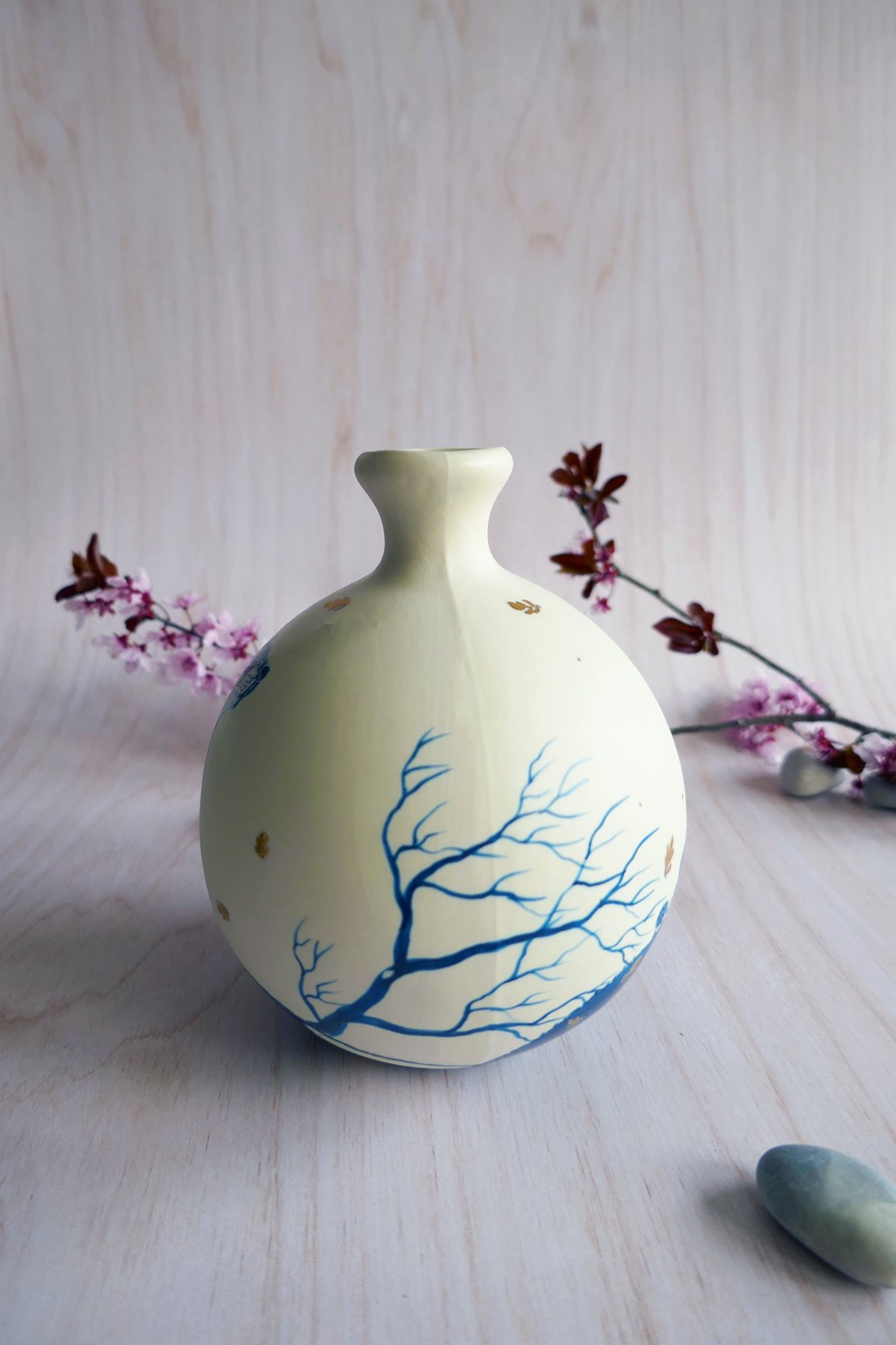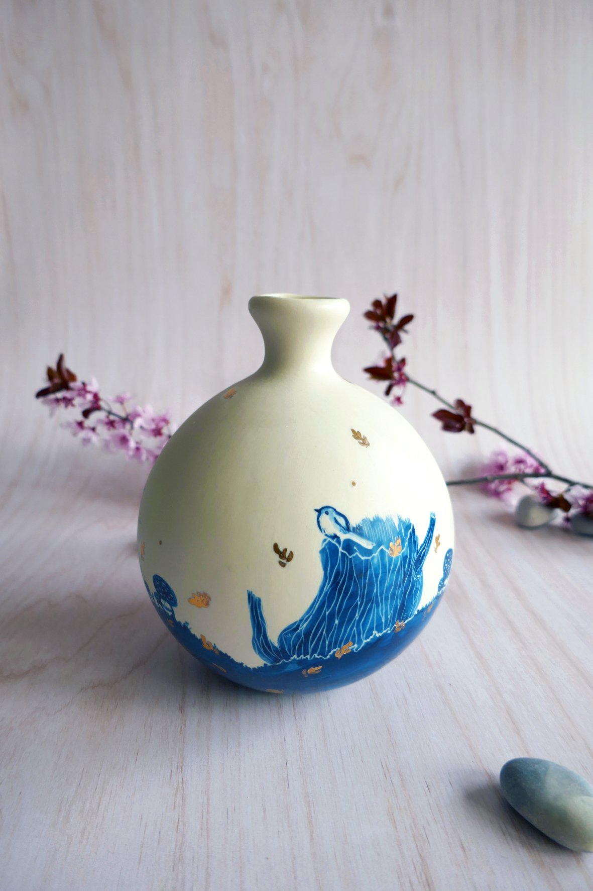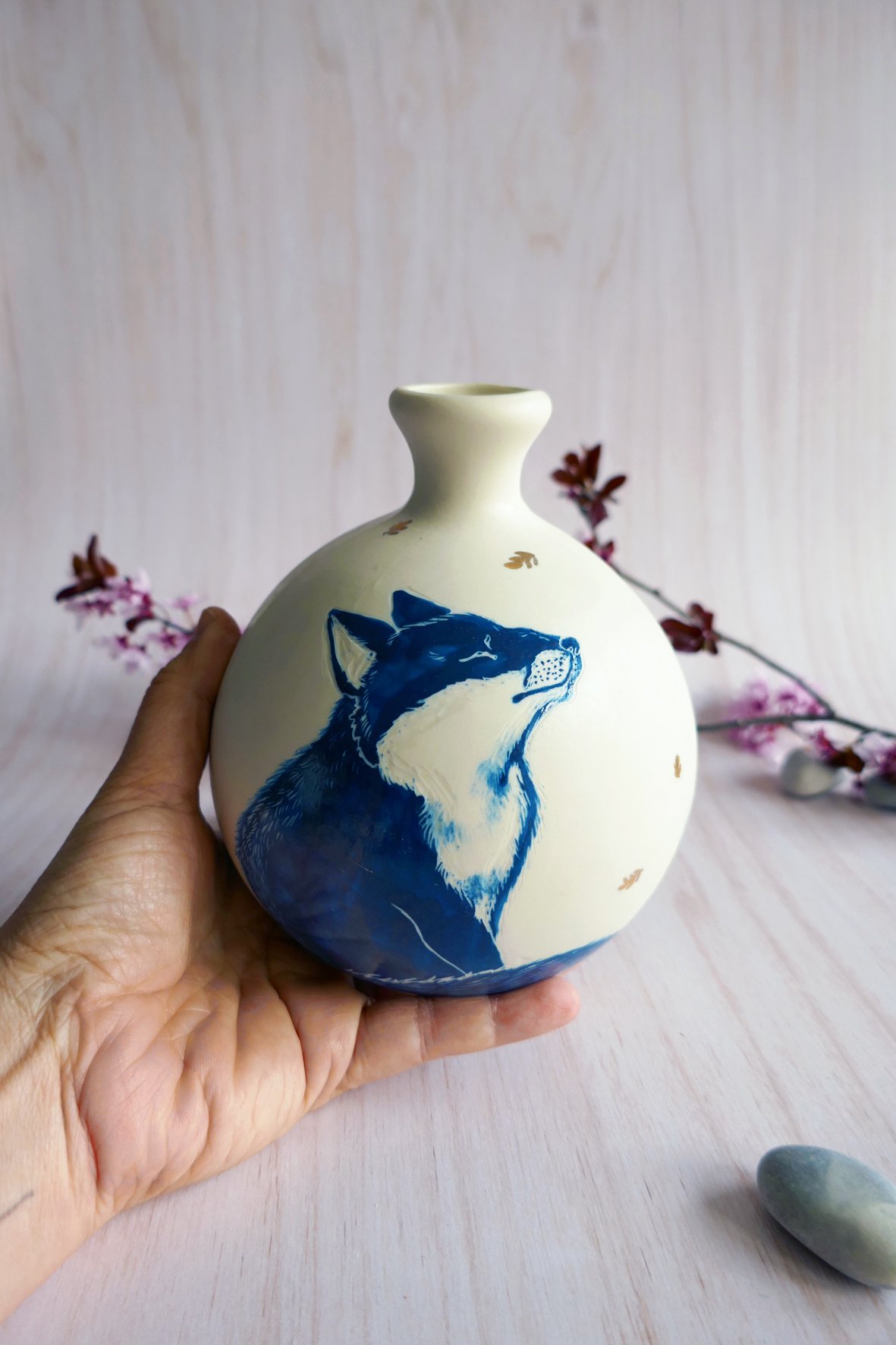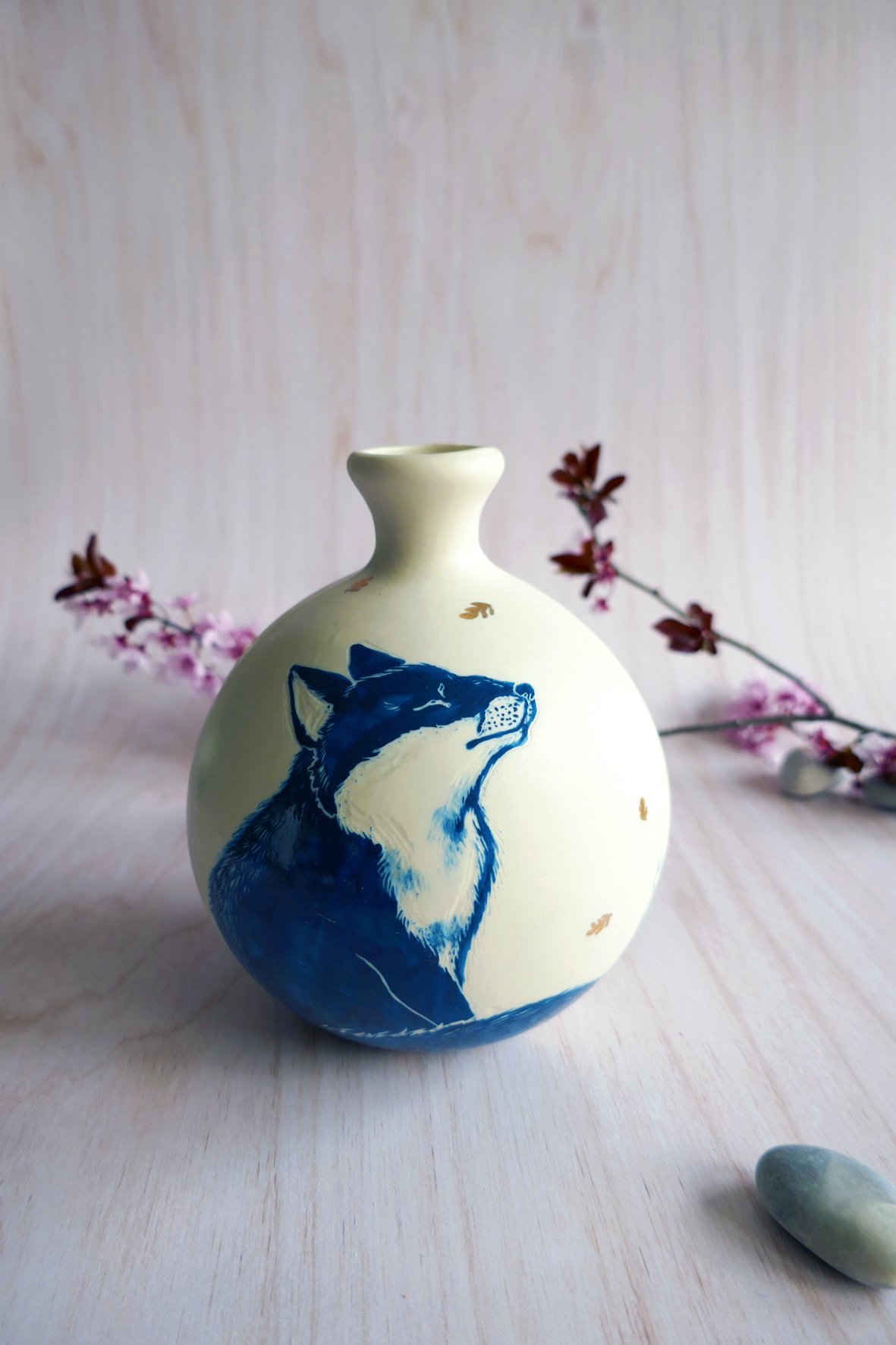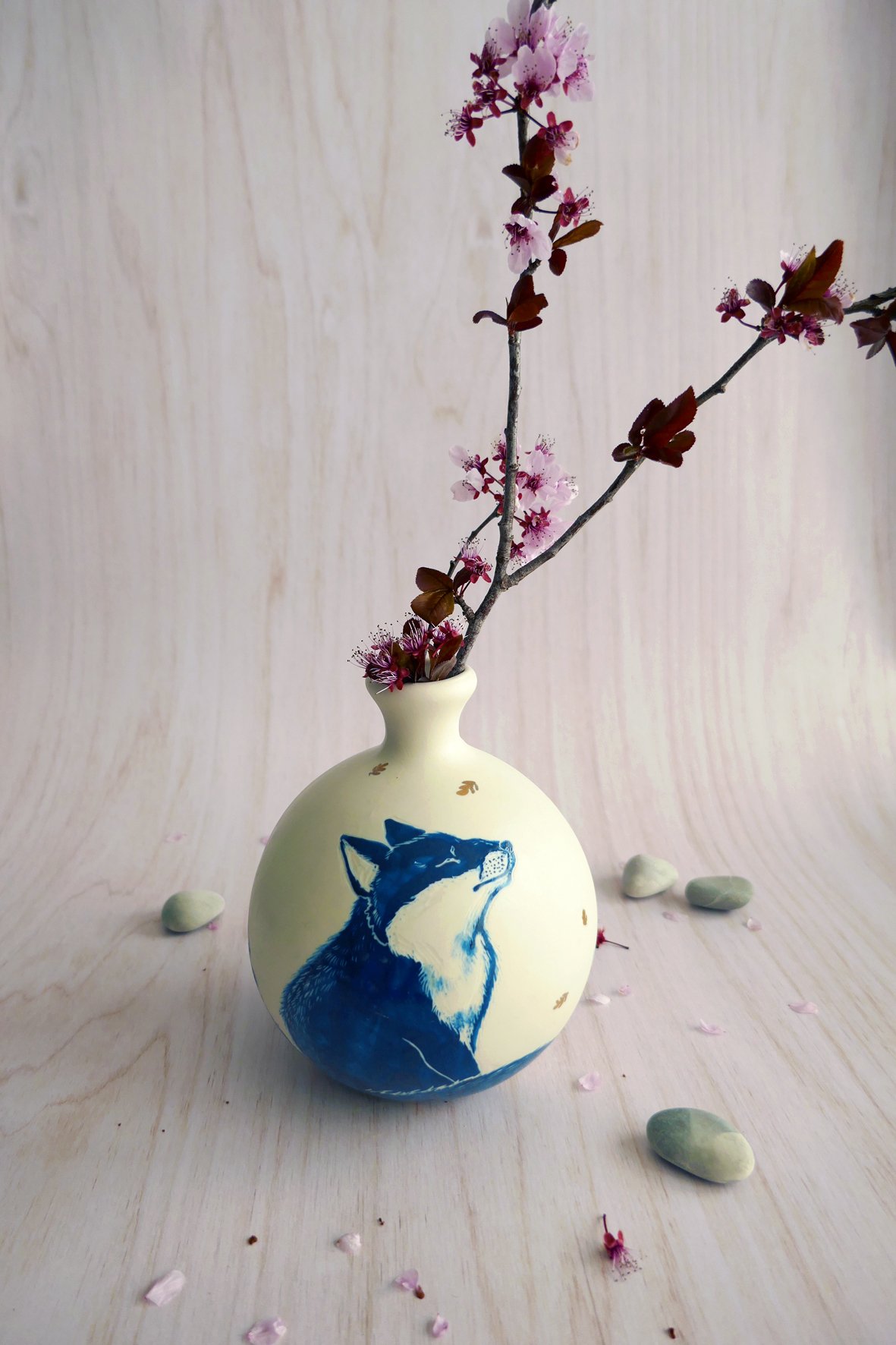 Vase en porcelaine façonnée via la technique du coulage artisanal. Il s’agit de mon ancienne collection porcelaine, entièrement illustrée à la main aux engobes et technique du sgraffito. La pièce est une première fois à 950° puis émaillée et cuite à 1250°, sa température finale de cuisson qui lui donne son aspect définitif et toute sa solidité ! Chaque pièce est unique avec son propre animal et motif différent.